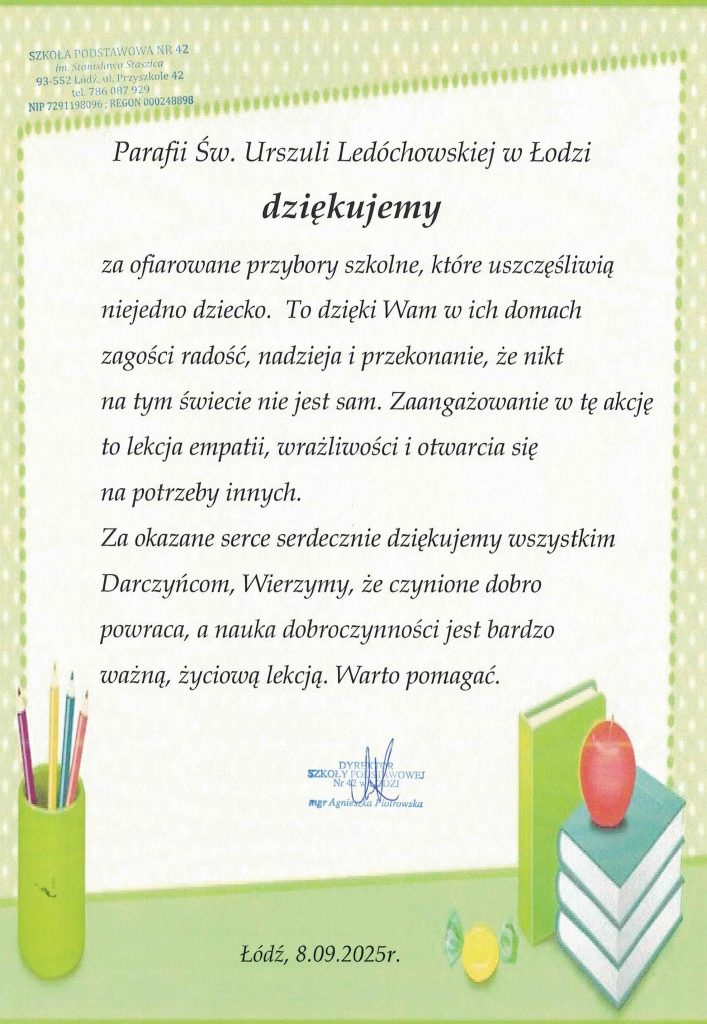 5. Z całego serca dziękujemy za ofiarowane przybory szkolne. Uszczęśliwią one niejedno dziecko. To dzięki Wam w ich domach zagościły radość, nadzieja i przekonanie, że nikt na tym świecie nie jest sam. Zaangażowanie w tę akcję to była lekcja empatii, wrażliwości i otwarcia się na potrzeby innych. Za okazane serce serdecznie dziękujemy wszystkim Darczyńcom, Wierzymy, że czynione dobro powraca, a nauka dobroczynności jest bardzo ważną, życiową lekcją.